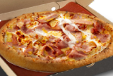 Πίτσα με ζαμπόν, ανανά, σάλτσα ντομάτας και μίξη ημίσκληρων τυριών (pizza with ham, chopped pineapple and a mixture of semi-hard cheese)