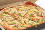 Πίτσα με μπέικον, φιλέτο στήθος κοτόπουλου, πιπεριές, σάλτσα ντομάτας και μίξη ημίσκληρων τυριών με μοτσαρέλα (pizza with bacon, chicken fillet, peppers and a mixture of semi-hard cheese with mozzarella)
