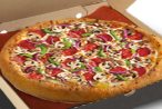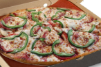 Πίτσα με μπέικον, φιλέτο στήθος κοτόπουλου, πιπεριές, σάλτσα ντομάτας και μίξη ημίσκληρων τυριών με μοτσαρέλα (pizza with bacon, chicken fillet, peppers and a mixture of semi-hard cheese with mozzarella)