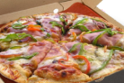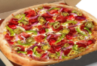 Πίτσα με ζαμπόν, μπέικον, φρέσκα μανιτάρια, πιπεριές, ντομάτα, σάλτσα ντομάτας και μίξη ημίσκληρων τυριών με μοτσαρέλα (pizza with a mixture of semi- hard cheese and mozarella, ham, tomatoes, bacon and peppers and fresh mushrooms)