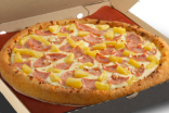 Πίτσα με ζαμπόν, ανανά, σάλτσα ντομάτας και μίξη ημίσκληρων τυριών (pizza with ham, chopped pineapple and a mixture of semi-hard cheese)