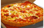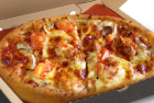 Πίτσα με ζαμπόν, μπέικον, φρέσκα μανιτάρια, πιπεριές, ντομάτα, σάλτσα ντομάτας και μίξη ημίσκληρων τυριών με μοτσαρέλα (pizza with a mixture of semi- hard cheese and mozarella, ham, tomatoes, bacon and peppers and fresh mushrooms)