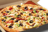 Πίτσα με μπέικον, φιλέτο στήθος κοτόπουλου, πιπεριές, σάλτσα ντομάτας και μίξη ημίσκληρων τυριών με μοτσαρέλα (pizza with bacon, chicken fillet, peppers and a mixture of semi-hard cheese with mozzarella)