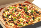 Πίτσα με πιπεριές, ελιές καλαμών, κρεμμύδι, ντομάτα, σάλτσα ντομάτας και μίξη ημίσκληρων τυριών με Φέτα (pizza with peppers, onions, olives, tomatoes, oregano and a mixture of semi-hard cheese and feta)