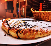 Μοναδικό Choco Calzone με πραλίνα σοκολάτας, σιρόπι σοκολάτας, τριμμένο μπισκότο και ζάχαρη άχνη. Απολαύστε το μόνο με 4,90 €
